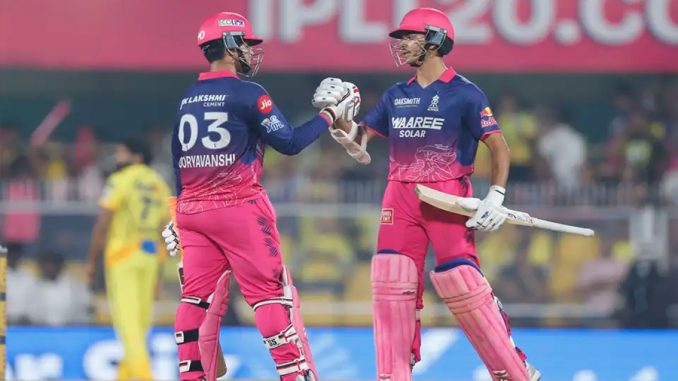 ഗുവാഹത്തി, ബര്‍സപര ക്രിക്കറ്റ് സ്റ്റേഡിയത്തില്‍ ടോസ് നഷ്ടപ്പെട്ട് ബാറ്റിംഗിനെത്തിയ ചെന്നൈ 19.4 ഓവറില്‍ 127ന് എല്ലാവരും പുറത്തായി. രണ്ട് വിക്കറ്റ് വീതം വീഴ്ത്തിയ നന്ദ്രെ ബര്‍ഗര്‍, ജോഫ്ര ആര്‍ച്ചര്‍, രവീന്ദ്ര ജഡേജ എന്നിവരാണ് തകര്‍ത്തത്. 36 പന്തില്‍ 43 റണ്‍സ് നേടിയ ജാമി ഓവര്‍ടോണാണ് ചെന്നൈയുടെ ടോപ് സ്‌കോറര്‍. ചെന്നൈക്ക് വേണ്ടിയുള്ള അരങ്ങേറ്റത്തില്‍ സഞ്ജു സാംസണ്‍ (6) നിരാശപ്പെടുത്തി. മറുപടി ബാറ്റിംഗില്‍ രാജസ്ഥാന്‍ 12.1 ഓവറില്‍ മൂന്ന് വിക്കറ്റ് നഷ്ടത്തില്‍ ലക്ഷ്യം മറികടന്നു. 17 പന്തില്‍ 52 റണ്‍സ് നേടിയ വൈഭവ് സൂര്യവന്‍ഷിയാണ് രാജസ്ഥാനെ വിജയത്തിലേക്ക് നയിച്ചത്. യശസ്വ ജയ്‌സ്വാള്‍ 38 റണ്‍സുമായി പുറത്താവാതെ നിന്നു